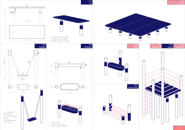 Trunks, as nodes of a spatial scheme, are connected by content elements that, as links, mutually form spatial ambiences - program zones. Within the transformable network, trunks are positioned and programmed to support and combine different sets of pre-determined content elements (project-defined), as well as to embrace new, unpredictable elements (by addition and improvisation in the future). In this way, the social network, as an open spatial-program system, enables different variations depending on the actors, number and type of basic units of the structure and content elements, ie size, layout and combinatorics of the program zones, as well as the existing situation on the site (layout of the park greenery, trail, etc).